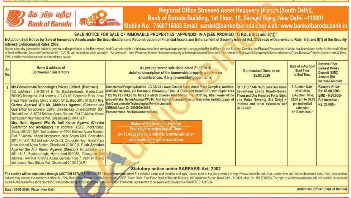 Commercial Property/Unit No. LG-CS-03, Lower Ground Floor, Ansal Plaza Complex, Ward No. 058/0466 Vaishali, Vill Hasanpur, Bhowapur, Tehsil & Distt- Ghaziabad (UP) with Super Area 1120 Sq. Ft. (104.05 Sq. Mtrs.) in which Covered Area 674 Sq. Fts. (62.61 Sq. Mtrs.) owner of the property Mrs. Nalini Agarwal W/o Mr. Anil Kumar Agarwal