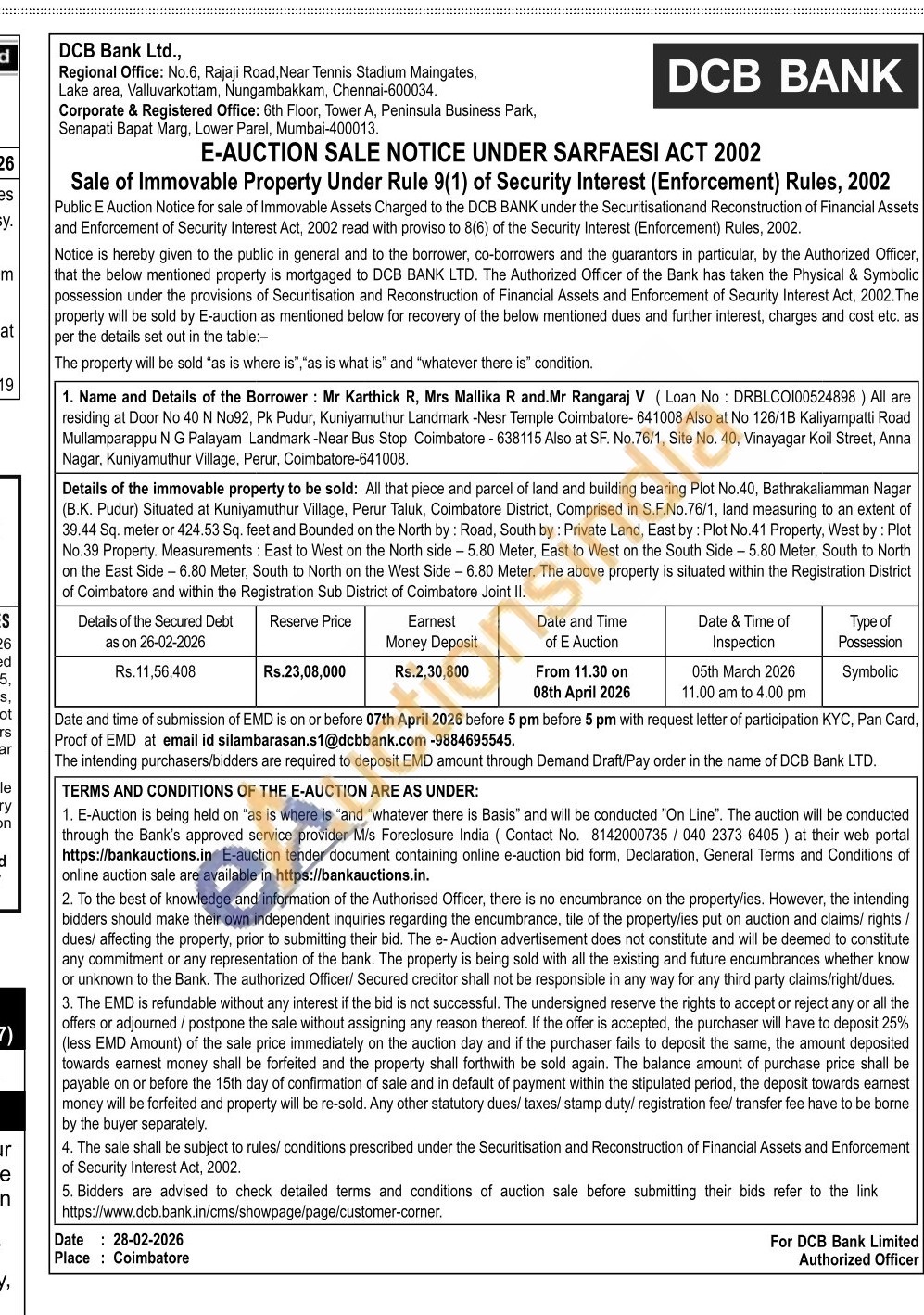 Details of the immovable property to be sold: All that piece and parcel of land and building bearing Plot No.40, Bathrakaliamman Nagar (B.K. Pudur) Situated at Kuniyamuthur Village, Perur Taluk, Coimbatore District, Comprised in S.F.No.76/1, land measuring to an extent of 39.44 Sq. meter or 424.53 Sq. feet and Bounded on the North by: Road, South by: Private Land, East by: Plot No.41 Property, West by: Plot No.39 Property. Measurements: East to West on the North side-5.80 Meter, East to West on the South Side-5.80 Meter, South to North on the East Side -6.80 Meter, South to North on the West Side - 6.80 Meter. The above property is situated within the Registration District of Coimbatore and within the Registration Sub District of Coimbatore Joint II