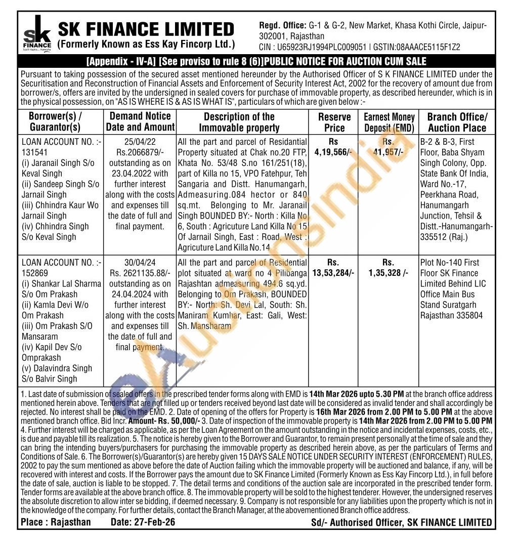 All the part and parcel of Residential plot situated at ward no 4 Pilibanga Rajashtan admeasuring 494.6 sq.yd. Belonging to Om Prakash, BOUNDED BY: North: Sh. Devi Lal, South: Sh. Maniram Kumhar, East: Gali, West: Sh. Mansharam