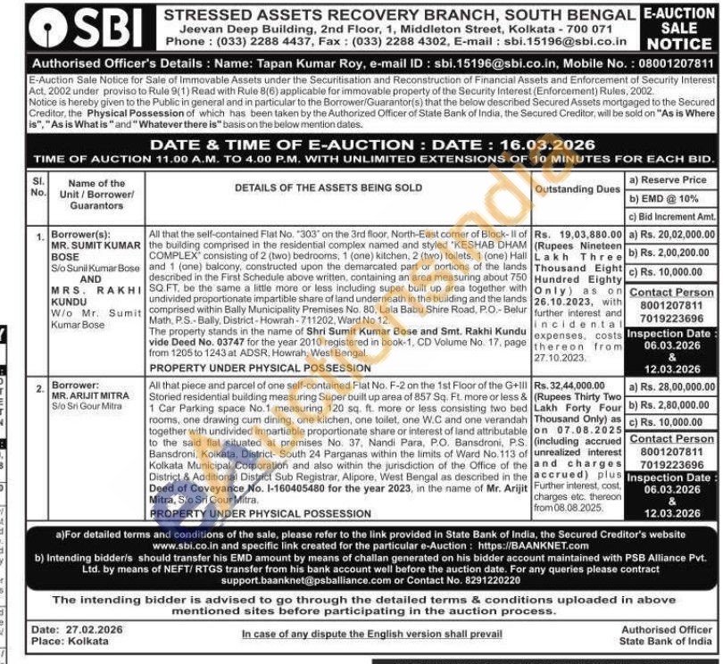 All that piece and parcel of one self-contained Flat No. F-2 on the 1st Floor of the G+III Storied residential building measuring Super built up area of 857 Sq. Ft. more or less & 1 Car Parking space No.1 measuring 120 sq. ft. more or less consisting two bed rooms, one drawing cum dining, one kitchen, one toilet, one W.C and one verandah together with undivided impartiable proportionate share or interest of land attributable to the said flat situated at premises No. 37. Nandi Para, P.O. Bansdroni, P.S. Bansdroni, Kolkata, District- South 24 Parganas within the limits of Ward No. 113 of Kolkata Municipal Corporation and also within the jurisdiction of the Office of the District & Additional District Sub Registrar, Alipore, West Bengal as described in the Deed of Coveyance No. 1-160405480 for the year 2023, in the name of Mr. Arijit Mitra, Sio Sri Gour Mitra.