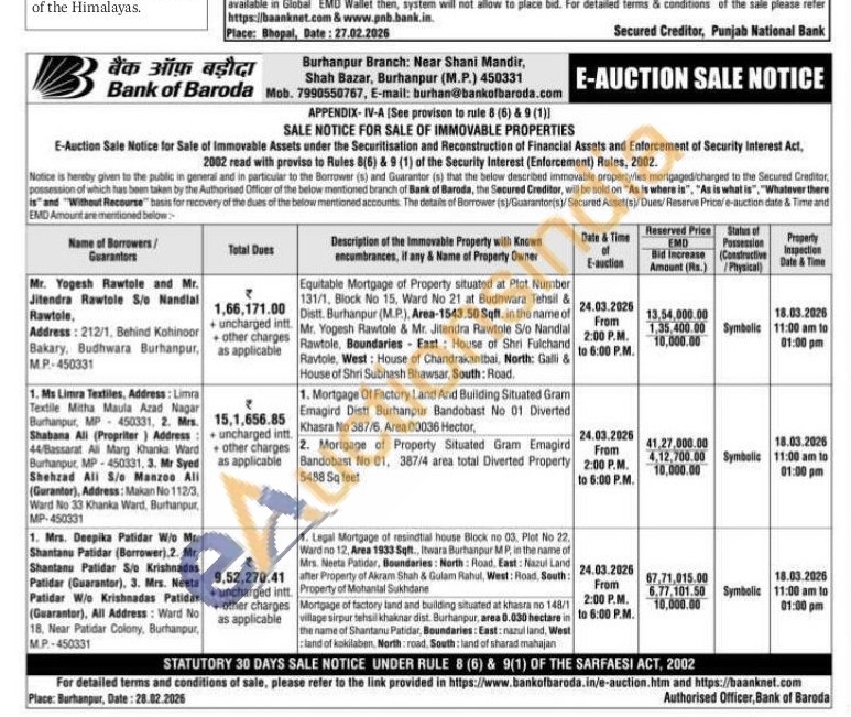 Equitable Mortgage of Property situated at Plot Number 131/1, Block No 15, Ward No 21 at Budhwara Tehsil & Distt. Burhanpur (M.P.), Area-1543.50 Sqft, in the name of Mr. Yogesh Rawtole & Mr. Jitendra Rawtole S/o Nandlal Rawtole, Boundaries East House of Shri Fulchand Ravtole, West: House of Chandrakantbai, North: Galli & House of Shri Subhash Bhawsar, South: Road.