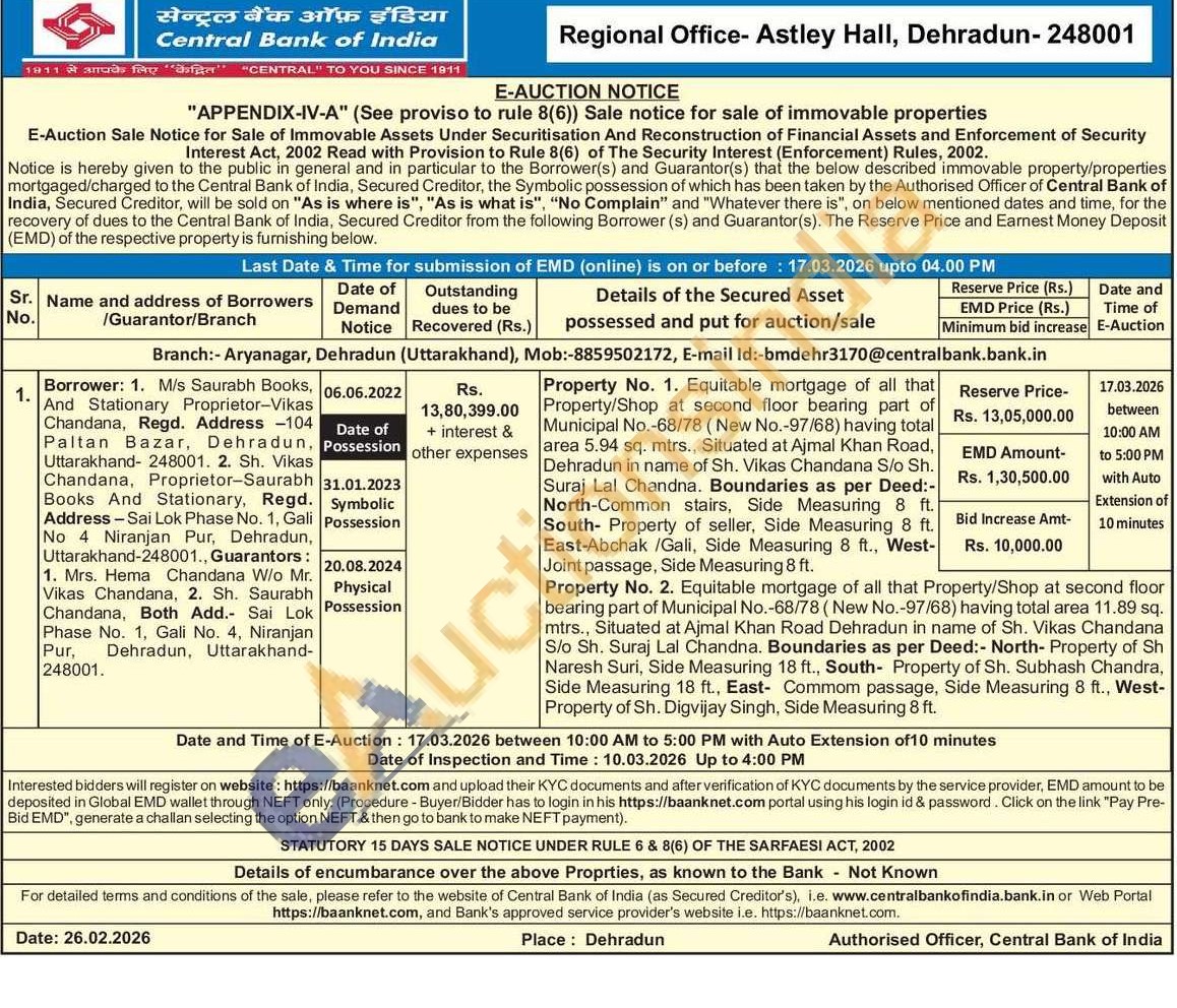 Equitable mortgage of all that Property/Shop at second floor bearing part of Municipal No.-68/78 (New No.-97/68) having total area 5.94 sq. mtrs., Situated at Ajmal Khan Road, Dehradun in name of Sh. Vikas Chandana S/o Sh. Suraj Lal Chandna. Boundaries as per Deed:-North-Common stairs, Side Measuring 8 ft. South- Property of seller, Side Measuring 8 ft. East-Abchak /Gali, Side Measuring 8 ft., West-Joint passage, Side Measuring 8 ft.