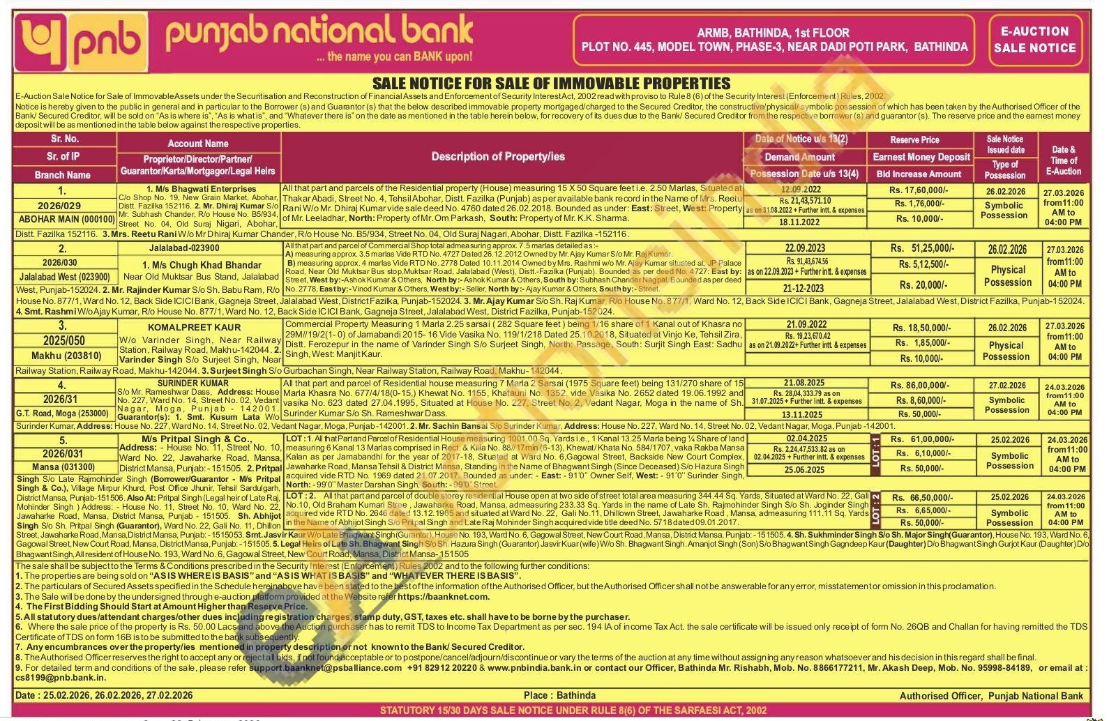 All that part and parcel of Residential house measuring 7 Maria 2 Sarsai (1975 Square feet) being 131/270 share of 15 Marla Khasra No. 677/4/18(0-15,) Khewat No. 1155, Khatauni No. 1352, vide Vasika No. 2652 dated 19.06.1992 and vasika No. 623 dated 27.04.1995, Situated at House No. 227, Street No. 2, Vedant Nagar, Moga in the name of Sh. Surinder Kumar S/o Sh. Rameshwar Dass