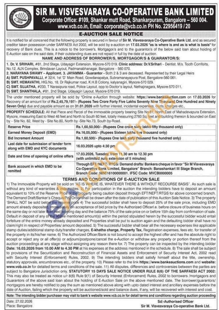 All that Piece and Parcel of the immovable property bearing Site No.81, North East of Mahadevapura Extension, Mysore, measuring East to West 46 feet and North to South 60 feet, totally measuring 2760 Sq. feet and building thereon & bounded on East by-Site No. 82. West by Site No.80, North by -Site No.73, South by-Road.