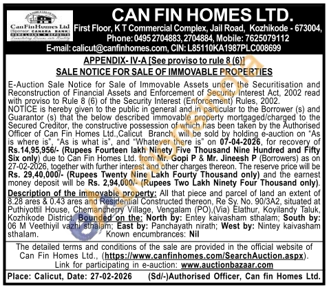 Description of the immovable property: All that piece and parcel of land an extent of 8.28 ares & 0.43 ares and Residential Constructed thereon, Re Sy. No. 90/3A2, situated at Puthiyottil House, Chemancherry Village, Vengalam (PO), (Via) Elathur, Koyilandy Taluk, Kozhikode District. Bounded on the: North by: Entey kaivasham sthalam; South by: 06 M Veethiyil vazhi sthalam; East by: Panchayath nirath; West by: Nintey kaivasham sthalam