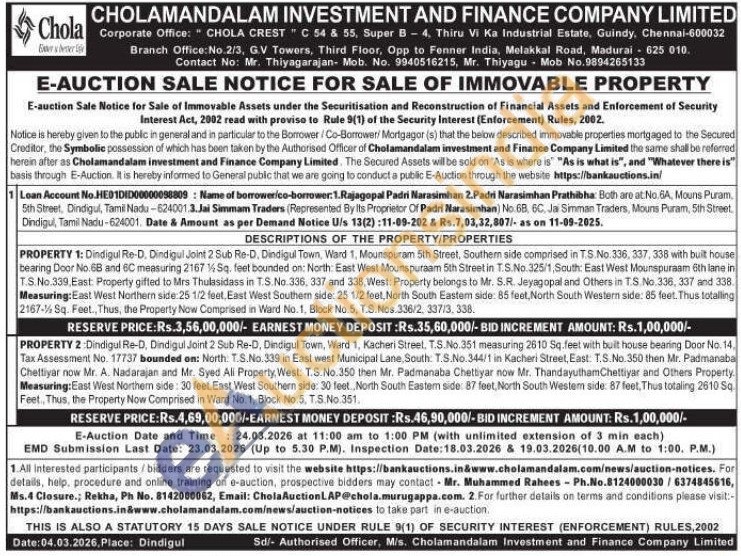 PROPERTY 2 Dindigul Re-D, Dindigul Joint 2 Sub Re-D, Dindigul Town, Ward 1, Kacheri Street, T.S.No.351 measuring 2610 Sq.feet with built house bearing Door No. 14. Tax Assessment No. 17737 bounded on: North T.S.No. 339 in East west Municipal Lane, South: T.S.No.344/1 in Kacheri Street, East. T.S.No. 350 then Mr. Padmanaba Chettiyar now Mr. A. Nadarajan and Mr. Syed All Property, West: T.S.No.350 then Mr. Padmanaba Chettyar now Mr. Thandayutham Chettiyar and Others Property. Measuring: East West Northern side: 30 feet. East West Southern side: 30 feet., North South Eastern side: 87 feet, North South Westem side: 87 feet, Thus totaling 2610 Sq. Feet, Thus, the Property Now Comprised in Ward No. 1, Block No.5, T.S.No.351
