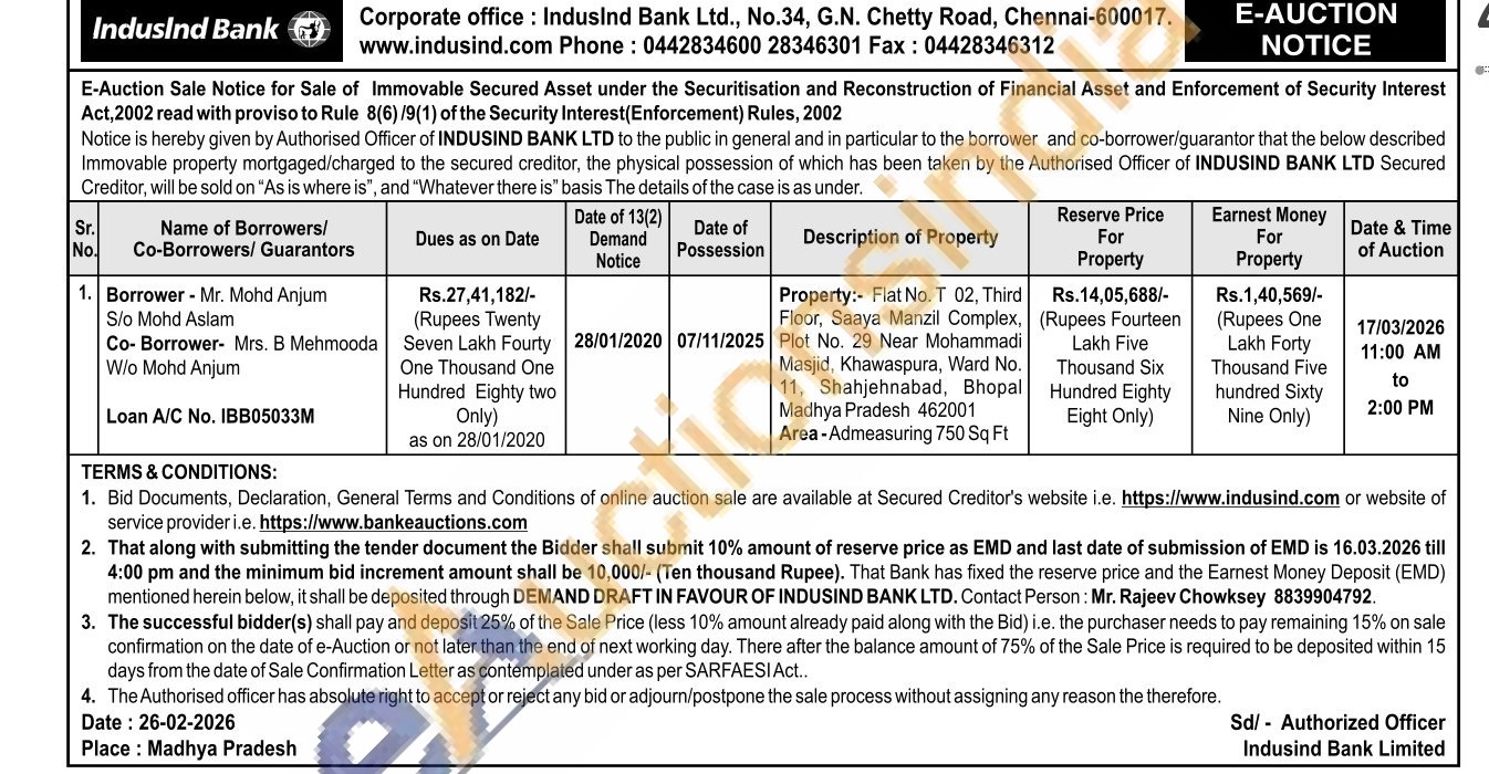 Property:- Flat No. T 02, Third Floor, Saaya Manzil Complex, Masjid, Khawaspura, Ward No. 11, Shahjehnabad, Bhopal Madhya Pradesh 462001 Area-Admeasuring 750 Sq Ft Plot No. 29 Near Mohammadi