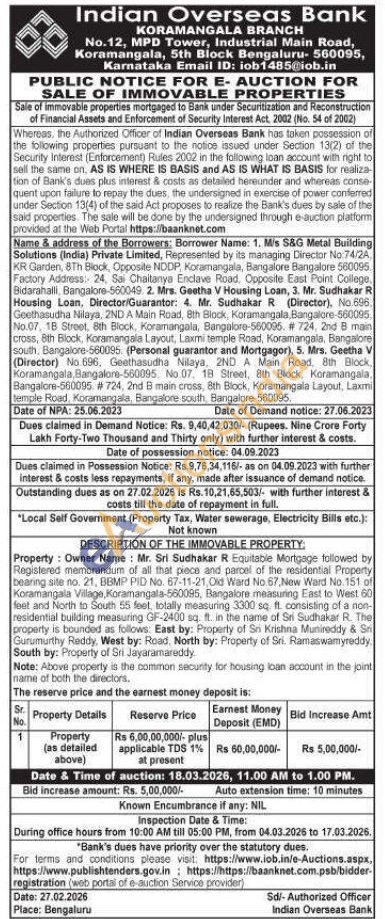 Property Owner Name: Mr. Sri Sudhakar R Equitable Mortgage followed by Registered memorandum of all that piece and parcel of the residential Property bearing site no. 21, BBMP PID No. 67-11-21 Old Ward No. 67, New Ward No. 151 of Koramangala Village, Koramangala-560095, Bangalore measuring East to West 60 feet and North to South 55 feet, totally measuring 3300 sq. ft. consisting of a non-residential building measuring GF-2400 sq. ft. in the name of Sri Sudhakar R. The property is bounded as follows: East by: Property of Sni Krishna Munireddy & S Gurumurthy Reddy, West by: Road, North by: Property of Sri. Ramaswamyreddy. South by: Property of Sri Jayaramareddy