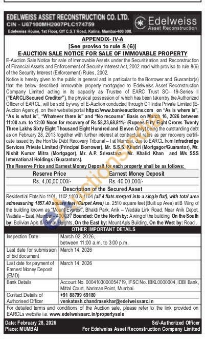 Residential Flats No 1101, 1102,1103 & 1104 (all 4 flats merged into a single flat), with total area admeasuring 1857.40 square feet (Carpet Area) i.e. 2510 square feet (Built up Area) at B Wing of the building known as "Mount Everest", Bhakti Park, Anik-Wadala Link Road, Near Anik Depot, Wadala-East, Mumbai-400037 Bounded: On the North by: Awing of the building, On the South by: Bolivian Apls & Gimar Heights, On the East by: Mount Apls Building. On the West by: Road