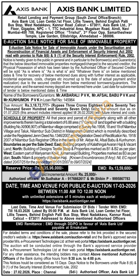 SCHEDULE OF PROPERTY: All that piece and parcel of the property along with all other improvements therein having a total extent of 6.88 ares (17 Cents) of land together with a building (Building No.XI/906,907) of Nilambur village comprised in Survey No. 195/6, 18 and 19 of Nilambur Village and Taluk, Nilambur Sub District in Malapuram District which is morefully described under the Registered Jenm Deed No. 1346/2007 and Registration Deed of Rectification No. 1918/2007 of Nilambur Sub Registrar Office in the name of Mr. Akbar Ali, Afsal Babu & Kunhumon. Boundaries as per the Sale Deed: East: Building property of Kalathingal Avaran Haji & Vacant Land; North: Building of Designs Textile Shop & Properties marked as B1 & B2 as per plan; West: Eastern part of Mariyaman Kovil, Jumamasjid Building, Properties marked as B3 as per plan; South: Nilam & property of Avaran Haji. [Known Encumbrances (If Any): Nil, EC report dated 20/07/25 for the period from 01/01/2007 to 09/07/2024]