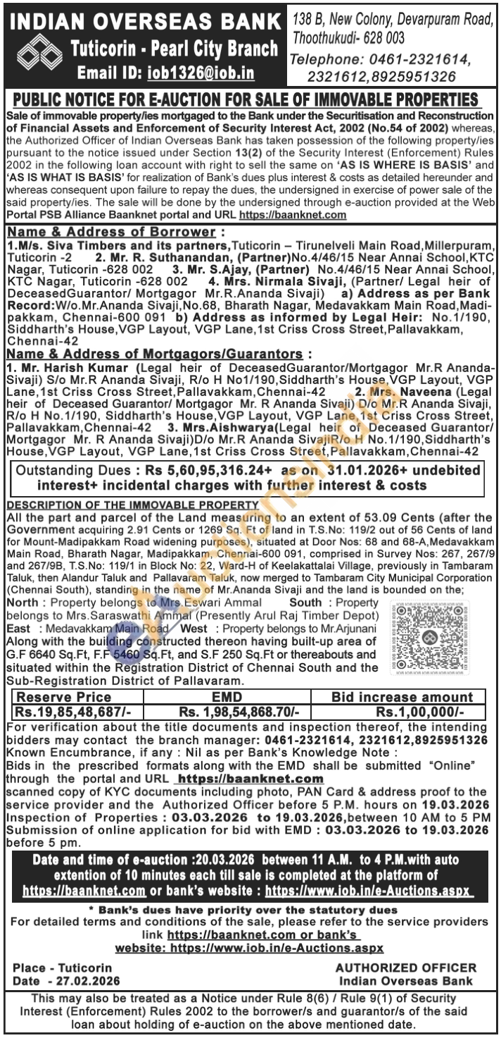All the part and parcel of the Land measuring to an extent of 53.09 Cents (after the Government acquiring 2.91 Cents or 1269 Sq. Ft of land in T.S.No: 119/2 out of 56 Cents of land for Mount-Madipakkam Road widening purposes), situated at Door Nos: 68 and 68-A, Medavakkam Main Road, Bharath Nagar, Madipakkam, Chennai-600 091, comprised in Survey Nos: 267, 267/9 and 267/9B, T.S.No: 119/1 in Block No: 22, Ward-H of Keelakattalai Village, previously in Tambaram Taluk, then Alandur Taluk and Pallavaram Taluk, now merged to Tambaram City Municipal Corporation (Chennai South), standing in the name of Mr. Ananda Sivaji and the land is bounded on the; North: Property belongs to Mrs. Eswari Ammal South Property belongs to Mrs. Saraswathi Ammal (Presently Arul Raj Timber Depot) East: Medavakkam Main Road West Property belongs to Mr.Arjunani Along with the building constructed thereon having built-up area of G.F 6640 Sq.Ft, F.F 5460 Sq. Ft, and S.F 250 Sq.Ft or thereabouts and situated within the Registration District of Chennai South and the Sub-Registration District of Pallavaram.