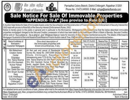 All that part and parcel of Open Piot Survey No Aaraj No. 2088 Stuated at Keer Kheda, Chittorgarh Rajasthan 312001 Admeasuring area 645 Sq Fest in the name of Sint Geeta Devi Wilo Shri Shyam Sundar Garg Bounded by North Prem Chand Shama, South Road, East Paras Kanwar, West SerHouse Other Encumbrances Not Known