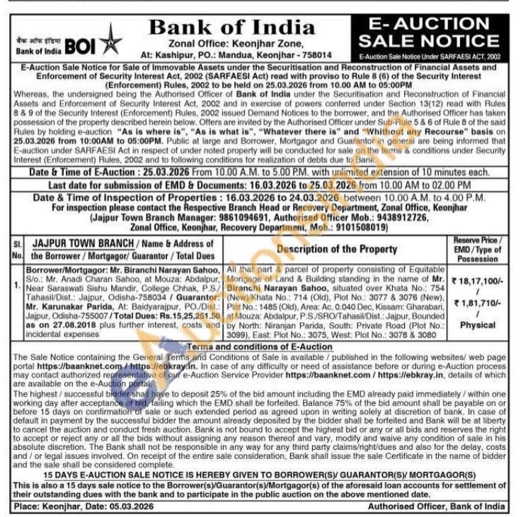 All that part & parcel of property consisting of Equitable Mortgage of Land & Building standing in the name of Mr. Biranchi Narayan Sahoo, situated over Khata No.: 754 (New)/Khata No.: 714 (Old), Plot No.: 3077 & 3076 (New), Plot No.: 1485 (Old), Area: Ac. 0.040 Dec, Kissam: Gharabari, at Mouza: Abdalpur, P.S./SRO/Tahasil/Dist.: Jajpur, Bounded by North: Niranjan Parida, South: Private Road (Plot No.: 3099), East: Plot No.: 3075, West: Plot No.: 3078 & 3080