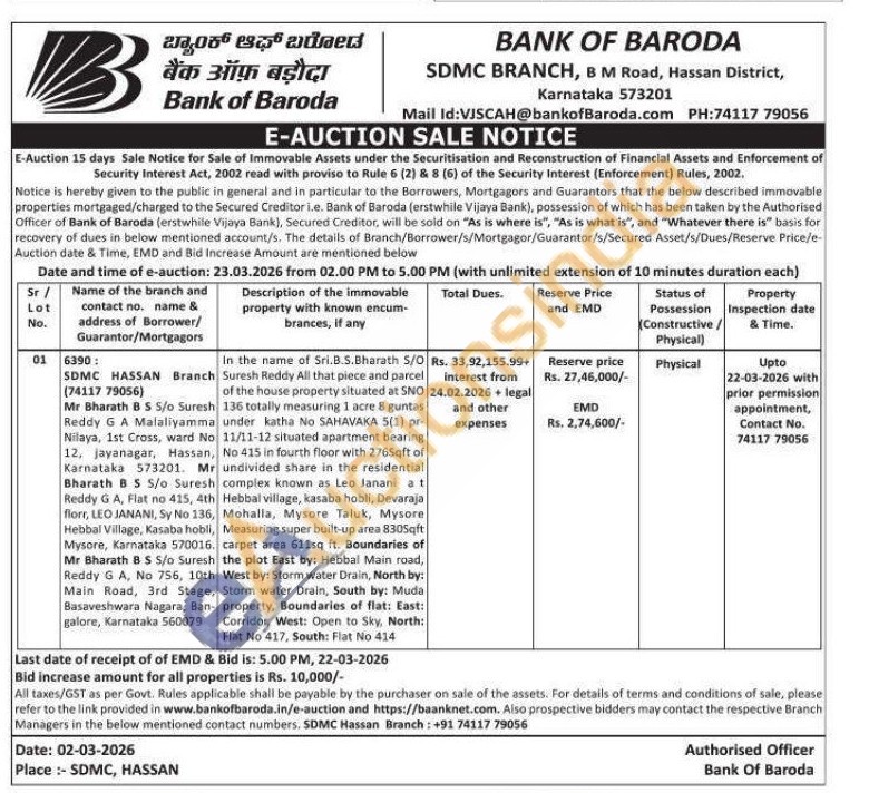 In the name of Sri.B.S.Bharath S/O Suresh Reddy All that piece and parcel of the house property situated at SNO Suresh 136 totally measuring 1 acre 8 guntas under katha No SAHAVAKA 5(1) pr-No 11/11-12 situated apartment bearing , No 415 in fourth floor with 2765qft of Mr undivided share in the residential Suresh complex known as Leo Janani a t 4th Hebbal village, kasaba hobli, Devaraja 136, Mohalla, Mysore Taluk, Mysore hobli, Measuring super built-up area 830Sqft carpet area 611sq ft. Boundaries of the plot East by: Hebbal Main road, West by: Storm water Drain, North by: Storm water Drain, South by: Muda property, Boundaries of flat: East: Corridor, West: Open to Sky, North: Flat No 417, South: Flat No 414