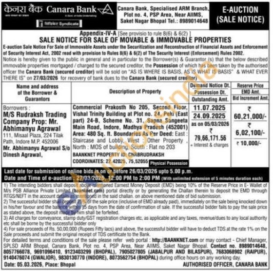 Commercial Prakosth No 205, Second Floor, Vishal Trinity Building at Plot no. 24, Peki (East part) 24-B. Scheme No. 31, Sapna Sangeeta Main Road, Indore, Madhya Pradesh (452001) Area: 480 Sq. ft. Boundaries As Per Deed: East: Staircase and Lobby, West: Other Property. North: MOS of building, South: Flat no 203