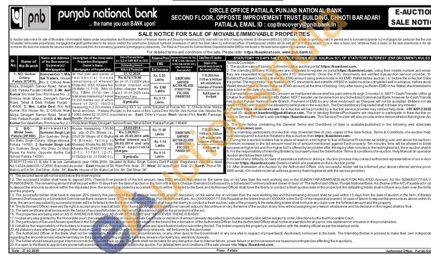 Contact EMAIL ID: coptlrecovery@pnb.bank.in