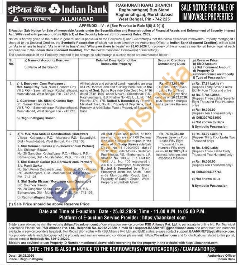All that piece and parcel of Land measuring an area of 4.25 Decimal land and building thereupon, in the name of Smt. Sanju Roy vide Sale Deed No. 1-116 dated 07.01.1997, under Mouza - Srikantabati, P.S. Raghunathganj, R.S. Khatian No. 4281. JL. No. 114, Plot No. 474, 475. Butted & Bounded by: North: Metalled Road, South: Property of Dilip Saha, East: Property of Akhil Saha, West: Property of Biswanath Saha