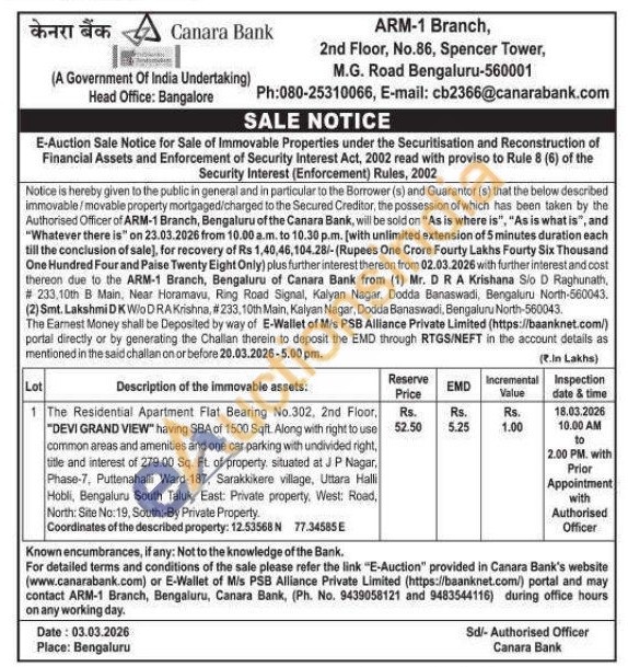 The Residential Apartment Flat Bearing No.302, 2nd Floor, "DEVI GRAND VIEW" having SBA of 1500 Sqft. Along with right to use common areas and amenities and one car parking with undivided right, title and interest of 279.00 Sq. Ft. of property, situated at JP Nagar, Phase-7, Puttenahalli Ward-187, Sarakkikere village, Uttara Halli Hobli, Bengaluru South Taluk East: Private property, West: Road,