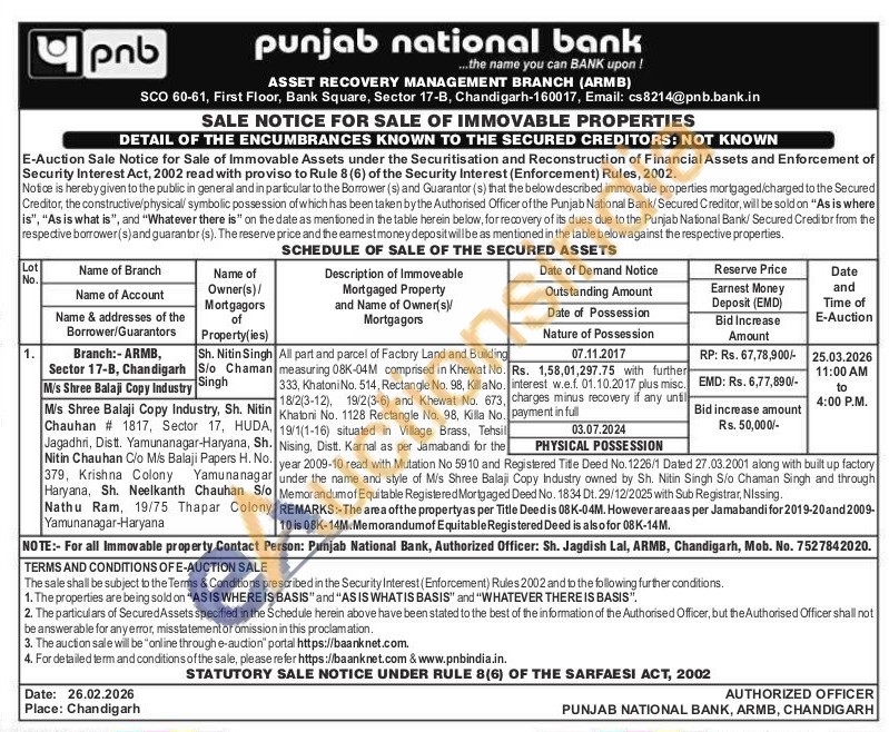 All part and parcel of Factory Land and Building measuring 08K-04M comprised in Khewat No. 333, Khatoni No. 514, Rectangle No. 98, Killa No. 18/2(3-12), 19/2(3-6) and Khewat No. 673, Khatoni No. 1128 Rectangle No. 98, Killa No. 19/1(1-16) situated in Village Brass, Tehsil Nising, Distt. Karnal as per Jamabandi for the year 2009-10 read with Mutation No 5910 and Registered Title Deed No. 1226/1 Dated 27.03.2001 along with built up factory under the name and style of M/s Shree Balaji Copy Industry owned by Sh. Nitin Singh S/o Chaman Singh and through Memorandum of Equitable Registered Mortgaged Deed No. 1834 Dt. 29/12/2025 with Sub Registrar, Nissing. REMARKS:-The area ofthe property as per Title Deed is 08K-04M. However areaas per Jamabandi for 2019-20 and 2009-10 is 08K-14M.Memorandum of Equitable Registered Deed is also for 08K-14M.