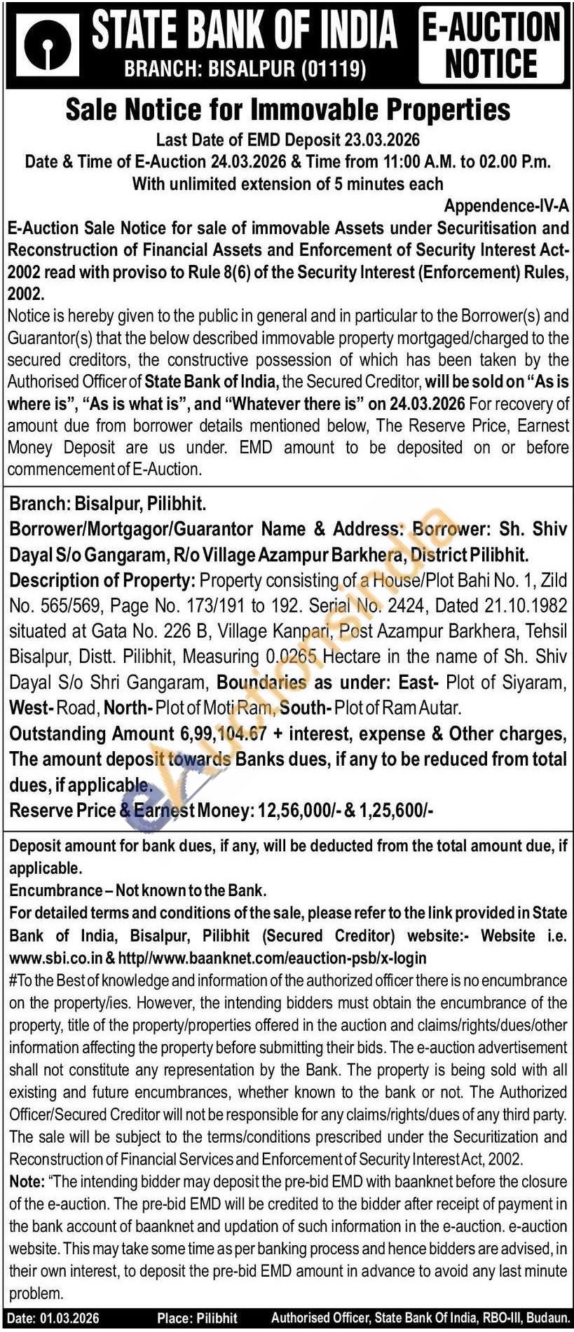 Description of Property: Property consisting of a House/Plot Bahi No. 1, Zild No. 565/569, Page No. 173/191 to 192. Serial No. 2424, Dated 21.10.1982 situated at Gata No. 226 B, Village Kanpari, Post Azampur Barkhera, Tehsil Bisalpur, Distt. Pilibhit, Measuring 0.0265 Hectare in the name of Sh. Shiv Dayal S/o Shri Gangaram, Boundaries as under: East- Plot of Siyaram, West-Road, North-Plot of Moti Ram, South-Plot of Ram Autar