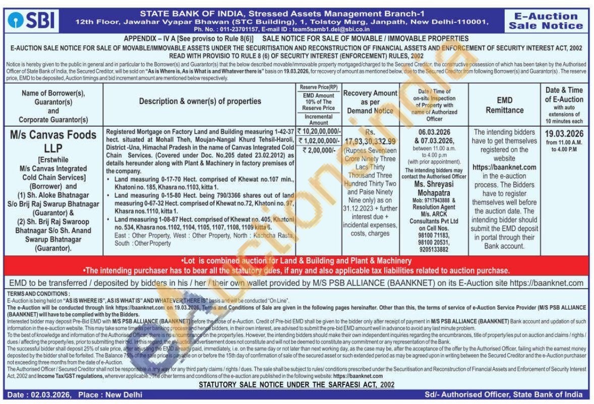 Registered Mortgage on Factory Land and Building measuring 1-42-37 hect. situated at Mohall Theh, Moujan-Nangal Khurd Tehsil-Haroli, District-Una, Himachal Pradesh in the name of Canvas Integrated Cold Chain Services. (Covered under Doc. No.205 dated 23.02.2012) as details hereunder along with Plant & Machinery in factory premises of the company. Land measuring 0-17-70 Hect. comprised of Khewat no.107 min., Khatoni no. 185, Khasra no. 1103, kitta 1. Land measuring 0-15-80 Hect. being 790/3366 shares out of land measuring 0-67-32 Hect. comprised of Khewat no.72, Khatoni no. 97, Khasra nos. 1110, kitta 1. Land measuring 1-08-87 Hect. comprised of Khewat no. 405, Khatoni no. 534, Khasra nos. 1102, 1104, 1105, 1107, 1108, 1109 kitta 6. East: Other Property, West: Other Property, North Kachcha Rasta, South: Other Property