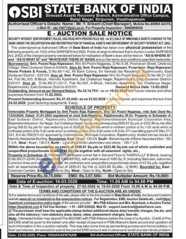 Immovable Property Mortgaged by Smt Posini Raja Rajeswari, W/o. Sri Posini Nagaraju, vide Sale Deed No. 1333/2024, Dated: 31.01.2024 registered at Joint Sub-Registrar, Rajahmundry (R.O): Property in Schedule- A: East Godavari District, Rajahmundry District Registry, Rajamahendravaram Municipal Corporation Area, Rajamahendravaram, Sai Nagar, Sai Chaitanya Nagar, house site admeasuring 2659.81 Sq.yds or 2223.86 sq.mts after giving 568.52 Sq.yds for road widening out of 3228.33 Sq.yds site which is northern portion of Ac. 1-20 cents which is northwest portion of Ac 5-42 cents which is northem portion of Ac.8-90 cents in R.S.No.371 now falling part of R. SNo. 371/2A1, B.A.No. 769/2011-G1 approved by Commissioner, Municipal Corporation, Rajahmundry, divided into two blocks of Harivillu Residential Building. Boundaries: East: Road-130-0 ft. South: Remaining site of Borra Vasundara Devi-183-1½ ft., West: Road-130-0 ft, North: Land of Kanumilli Lakshmidevi and others-185-1% ft. Within the above boundaries an extent of 2659.81 Sq.yds or 2223.86 Sq.mts out of which undivided and unspecified proportionate share of 43 Sq.yds together with all easement rights, etc., Property in Schedule- B: Flat No.303 northwest corner flat in Second Floor in "HARIVILLU" B-Block, bearing D.No.89-21-22/44 (Assessment No. 1064065782), with a plinth area of 1060 Sq. ft (including Staircase, balconies, Common Area and car parking area). An undivided and unspecified proportionate share of 43 Sq yds, together with all easementary rights, etc., out of 2659.81 Sq. Yds or 2223.86 Sq.Mts., (2 BHK). Bounded by: East: Common Corridor, South: Open to Sky, West: Open to Sky, North: Open to Sky.