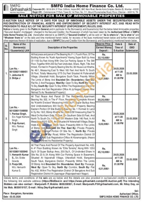 All That Peace And Parcel Of The Residential Apartment Bearing No. 502, In The 4th Floor, Residential Complete Known As "Kranthi Enclave" Measuring 1450 Sq Ft. Super Builtup Area And Undividedshare 300 Sq Ft (Formed In Property Bearing Eastern Portion Of Site Building Bearing No. 1 Formed in Land In Sy No. 16/2, Bbmp Khatha No. 2259/229/1measuring East To West On Northern Side 75 Feet, On Southern Side 55 Feet, And North To South On 116 Feet, On Western Side 146 Feet, In All Measuring 8515 Sq Ft. And Situated At Yelenahalli Village, Begur Hobli And Bangalore South Taluk, Presently With In The Limits of Bbmp And Bounded On The: East By: Private Property, West By: Western Portion Of Site No. 1, North By: Private Property, South By: Road, Within The Registration District Of Bangalore And Sub Registration Office At Koramangala. (Heare In After Reffered As Residential Property).