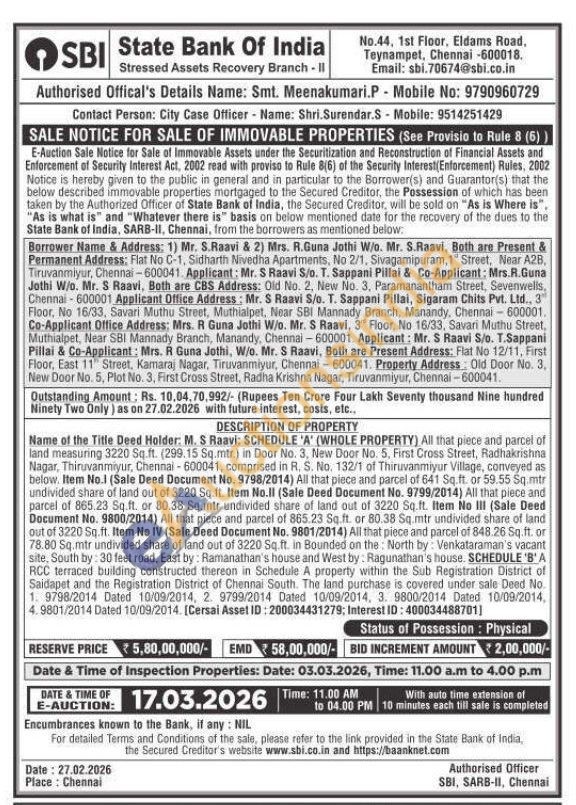 Name of the Title Deed Holder. M. S Raavi: SCHEDULE 'A' (WHOLE PROPERTY) All that piece and parcel of land measuring 3220 Sq.ft. (299.15 Sq.mtr.) in Door No. 3, New Door No. 5, First Cross Street, Radhakrishna Nagar, Thiruvanmiyur, Chennai-600041, comprised in R. S. No. 132/1 of Thiruvanmiyur Village, conveyed as below. Item No.1 (Sale Deed Document No. 9798/2014) All that piece and parcel of 641 Sq.ft. or 59.55 Sq.mtr undivided share of land out of 3220 Sq.ft. Item No.Il (Sale Deed Document No. 9799/2014) All that piece and parcel of 865.23 Sq.ft. or 80.38 Sq.mtr undivided share of land out of 3220 Sq.ft. Item No III (Sale Deed Document No. 9800/2014) All that piece and parcel of 865.23 Sq.ft. or 80.38 Sq.mtr undivided share of land out of 3220 Sq.ft. Item No IV (Sale Deed Document No. 9801/2014) All that piece and parcel of 848.26 Sq.ft. or 78.80 Sq.mtr undivided share of land out of 3220 Sq.ft. in Bounded on the North by: Venkataraman's vacant site, South by: 30 feet road, East by: Ramanathan's house and West by: Ragunathan's house. SCHEDULE 'B' A RCC terraced building constructed thereon in Schedule A property within the Sub Registration District of Saidapet and the Registration District of Chennai South. The land purchase is covered under sale Deed No. 1. 9798/2014 Dated 10/09/2014, 2. 9799/2014 Dated 10/09/2014, 3. 9800/2014 Dated 10/09/2014, 4.9801/2014 Dated 10/09/2014. [Cersai Asset ID: 200034431279; Interest ID: 400034488701