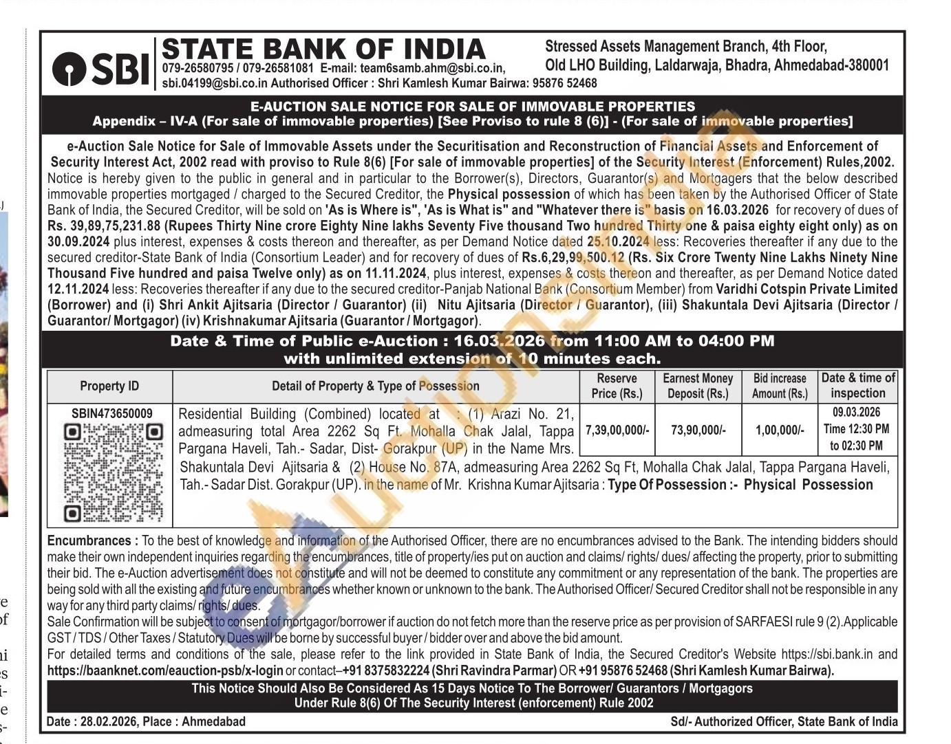 Residential Building (Combined) located at (1) Arazi No. 21, admeasuring total Area 2262 Sq Ft. Mohalla Chak Jalal, Tappa Pargana Haveli, Tah. Sadar, Dist- Gorakpur (UP) in the Name Mrs. Shakuntala Devi Ajitsaria & (2) House No. 87A, admeasuring Area 2262 Sq Ft, Mohalla Chak Jalal, Tappa Pargana Haveli, Tah.- Sadar Dist. Gorakpur (UP). in the name of Mr. Krishna Kumar Ajitsaria