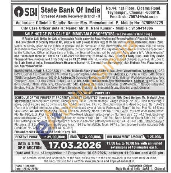SCHEDULE OF THE PROPERTY PROPERTY HEREBY CONVEYED: Name of the Title Deed Holder: Mr. Mahesh Ayar Viswanathan Kanchipuram District, Chengalpattu Taluk, Perumanthangal Village (Village No. 59) Land measuring 7 acres, out of 7 acres and 16 cents in S.No. 1/4-C then S.No. 1 A/4C. On subdivision, it is iden-tified as S. No. 1 A-402 (Part). It is divided into house plots, under the name and style of "Annai Padmavathi Nagar". In that, Plot No. 68 C and Villa Name: ATLAS 12 measuring 937 Sq. Feet abounded by, North: Plot No. 67C, South: 23 Feet Wide Road, West: Plot No. 63C, East: Plot No: 68 8 & 16 Feet Wide Road. Measuring East west on Northern side: 20-4.0" feet, East west on southern side: 20-4.0 feet, North South on western side: 400.0 feet, North South on Easter Side: 40-0.0" Feet, Totaling 937 Sq. Feet along with right of access in common pathway measuring 124 Sq. Feet. Total Extent conveyed Plot Area: 813 Sq. Feet, Commen Access Area: 124 Sq. feet (UDS), Total: 937 Sq. feet. (covered under Absolute Sale Deed Doc. No. 7365 of 2018 dated 18.06.2018)