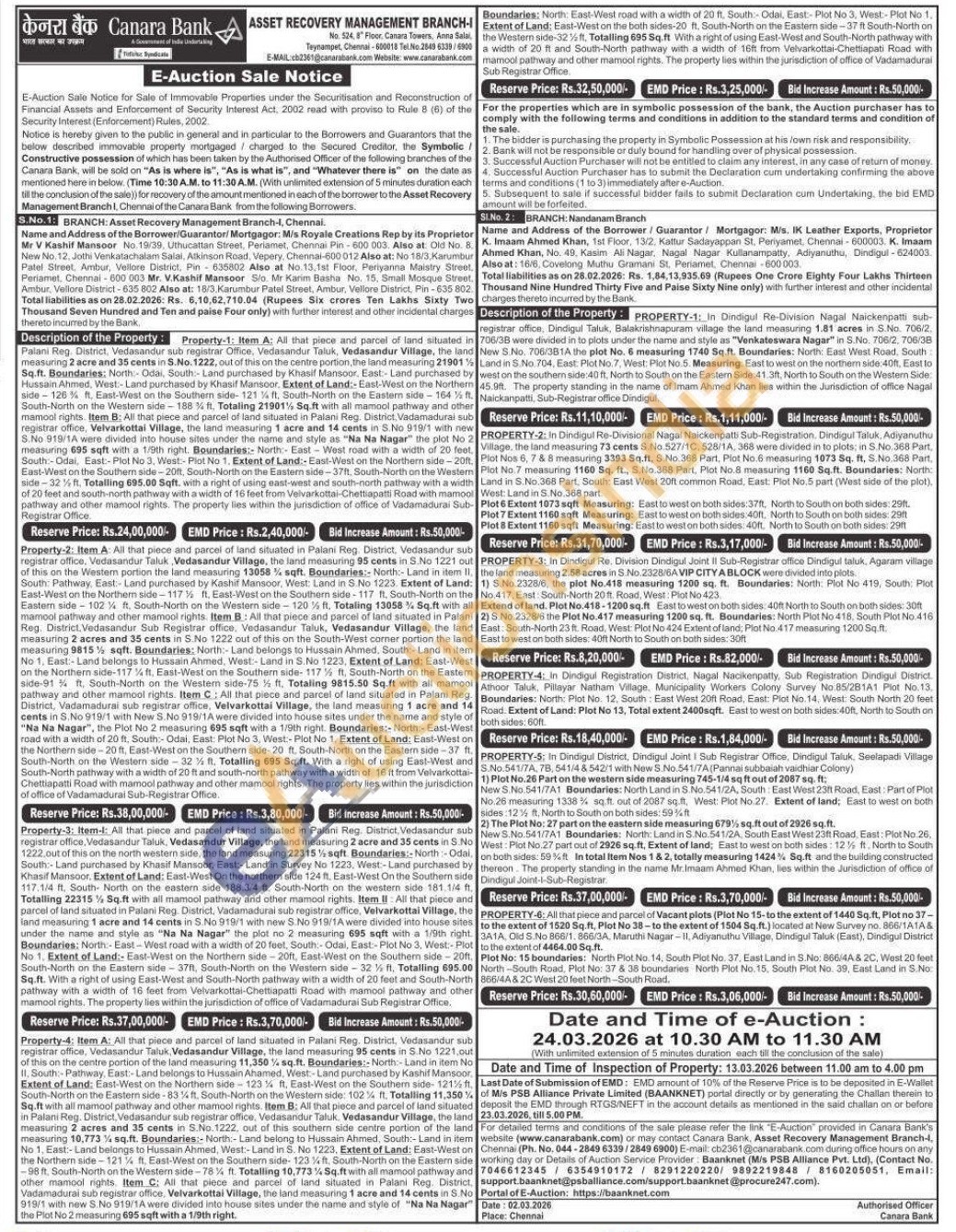 All that piece and parcel of land situated in Palani Reg. District, Vedasandur sub registrar office, Vedasandur Taluk, Vedasandur Village, the land measuring 95 cents in S.No 1221.out of this on the centre portion of the land measuring 11,350% sq.ft. Boundaries:-North:-Land in item No II. South: Pathway, East:-Land belongs to Hussain Ahamed, West:-Land purchased by Kashif Mansoor. Extent of Land: East-West on the Northern side-123% ft, East-West on the Southern side-121% f九 South-North on the Eastern side-83% ft. South-North on the Western side: 102% ft. Totalling 11,350% Sq.ft with all mamool pathway and other mamool rights. Item B: All that piece and parcel of land situated in Palani Reg. District, Vedasandur sub registrar office. Vedasandur Taluk. Vedasandur Village, the land measuring 2 acres and 35 cents in S.No.1222, out of this southern side centre portion of the land measuring 10,773 % sq.ft. Boundaries:- North:- Land belong to Hussain Ahmed, South:- Land in item No 1, East:-Land belongs to Hussain Ahmed, West:-Land in S. No 1223. Extent of Land: East-West on the Northern side-121% ft. East-West on the Southern side-123% ft. South-North on the Eastern side -98 ft. South-North on the Western side-78% ft. Totalling 10,773% Sq.ft with all mamool pathway and other mamool rights. Item C: All that piece and parcel of land situated in Palani Reg. District, Vadamadurai sub registrar office, Velvarkottai Village, the land measuring 1 acre and 14 cents in S.No 919/1 with new S.No 919/1A were divided into house sites under the name and style of "Na Na Nagar" the Plot No 2 measuring 695 sqft with a 1/9th rightExtent of Land: East-West on the both sides-20 ft. South-North on the Eastern side-37 ft South-North on the Western side-32% ft. Totalling 695 Sq.ft With a right of using East-West and South-North pathway with a width of 20 ft and South-North pathway with a width of 16ft from Velvarkottai-Chettiapati Road with mamool pathway and other mamool rights. The property lies within the jurisdiction of office of Vadamadurai Sub Registrar Office.