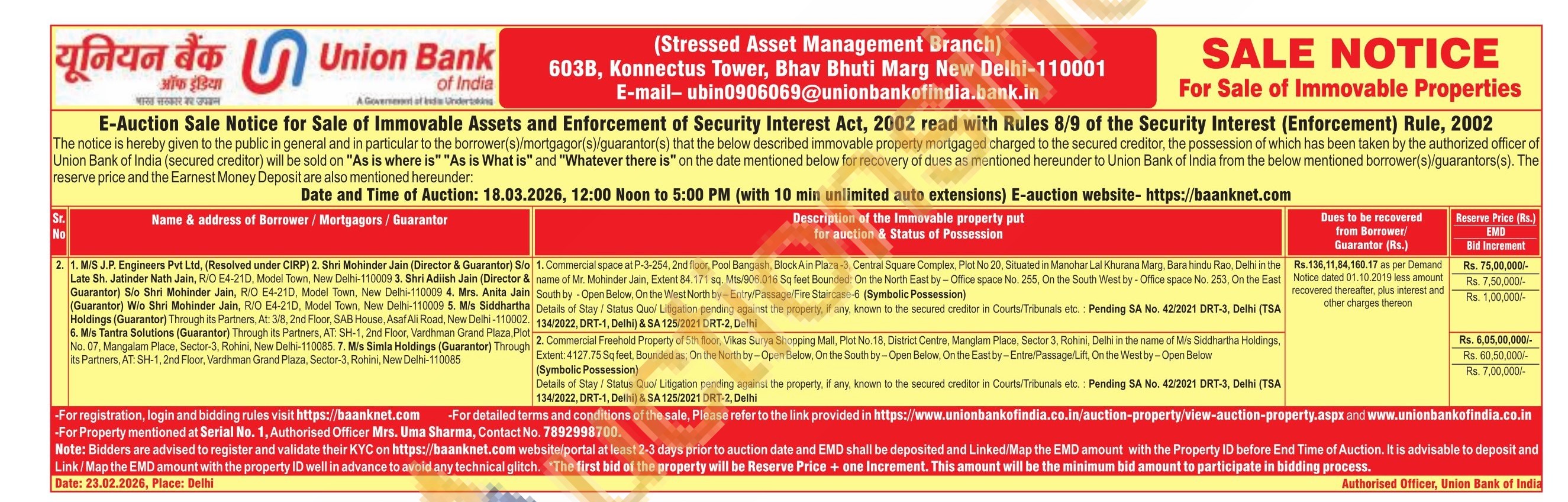 Commercial Freehold Property of 5th floor, Vikas Surya Shopping Mall, Plot No. 18, District Centre, Manglam Place, Sector 3, Rohini, Delhi in the name of M/s Siddhartha Holdings, Extent: 4127.75 Sq feet, Bounded as; On the North by-Open Below, On the South by - Open Below, On the East by-Entre/Passage/Lift, On the West by - Open Below (Symbolic Possession)