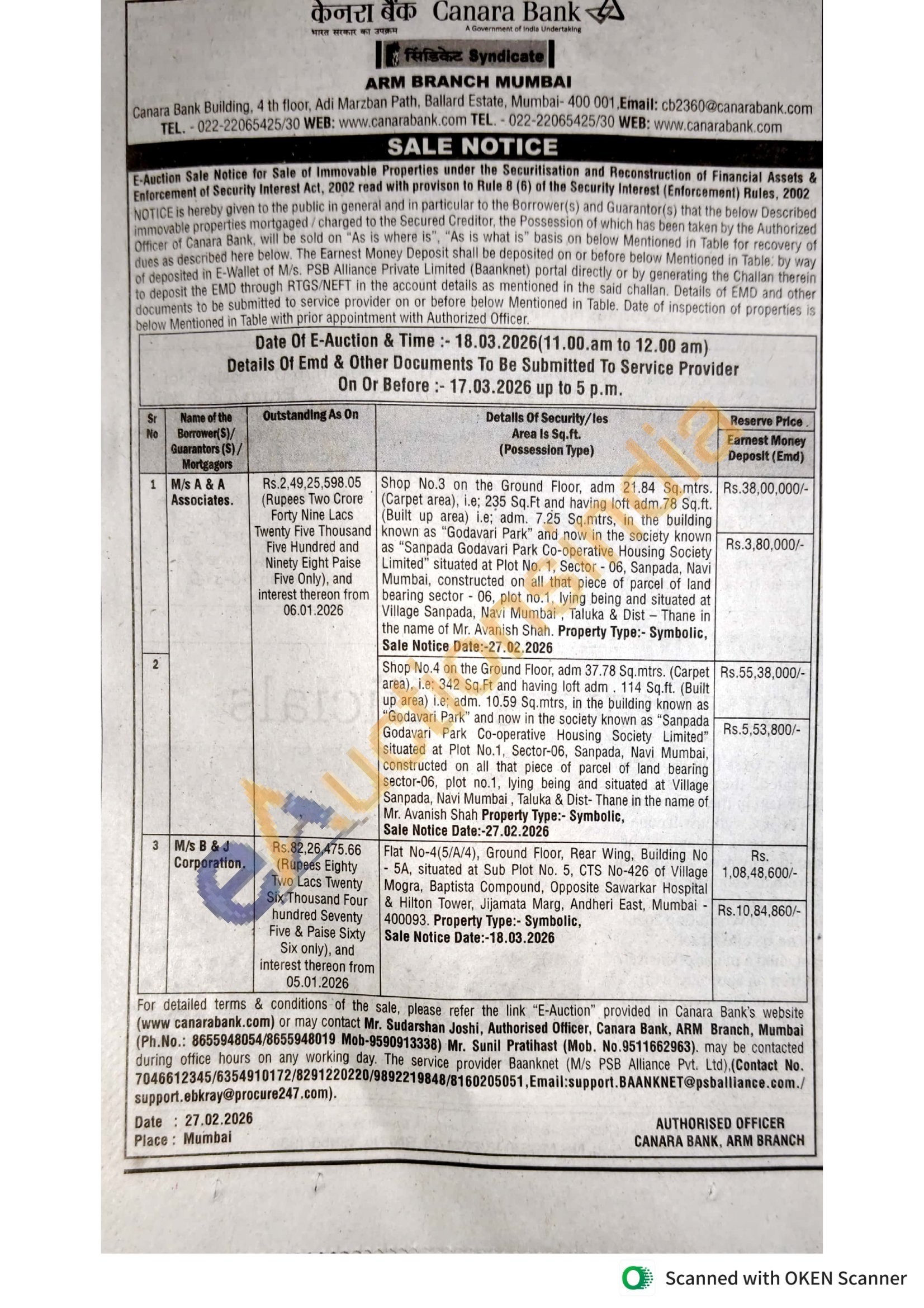 1) Shop No.3 on the Ground Floor, adm 21.84 Sq.mtrs. (Carpet area), le; 235 Sq.Ft and having loft adm.78 Sq.ft. (Built up area) le; adm. 7.25 Sq.mtrs, in the building known as "Godavari Park" and now in the society known as "Sanpada Godavari Park Co-operative Housing Society Limited situated at Plot No. 1, Sector-06, Sanpada, Navi Mumbai, constructed on all that piece of parcel of land bearing sector 06. plot no.1, lying being and situated at Village Sanpada, Navi Mumbai, Taluka & Dist- Thane in the name of Mr. Avanish Shah. Property Type:- Symbolic, Sale Notice Date:-27.02.2026