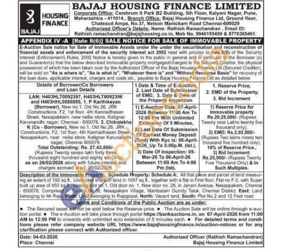 Description of the Immovable Property: Schedule Property: Schedule A: All that plece and parcel of land measur ing an extent of 192 sq. ft. Undivided share of land in 1087 sq.ft., together with a flat in First floor, Flat no F-2, with Super built up area of 450 sq ft., bearing plat no. 1. Old door no. 1. New door no. 26, in Janani Avenue, Nesappakam, Chennai 600078, Comprised in Survey No.86, Nesapakam Village. Mambalam Guindy Taluk, Chennal District. East: Land belonging to Mr Raju, West: Land belonging to Rajagopal, North: Vacant land, South: Plot No.2 and 12 Feet road