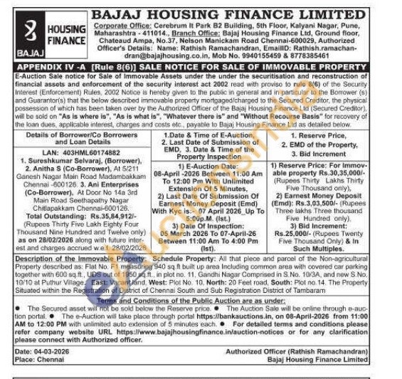 Description of the Immovable Property, Schedule Property: All that plece and parcel of the Non-agricultural Property described as: Flat No. F1 measuring 940 sq ft built up area Including common area with covered car parking together with 600 sq.ft., UDS out of 1950 sq ft., in plot no. 11, Gandhi Nagar Comprised in S. No. 10/3A, and new S.No. 10/10 at Puthur Village. East: Vacant land, West: Plot No. 10. North: 20 Feet road, South: Plot no 14. The Property Situated within the Registration of District of Chennai South and Sub Registration District of Tambaram