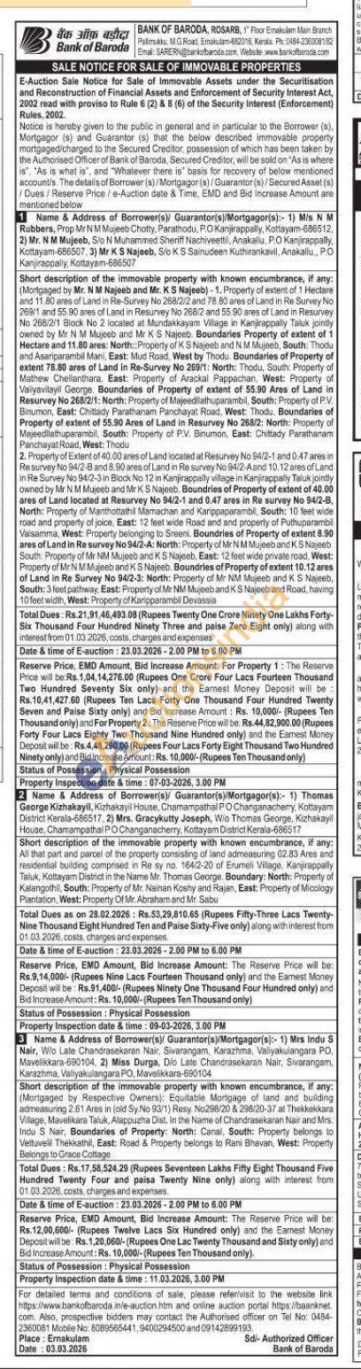 2. Property of Extent of 40.00 ares of Land located at Resurvey No 94/2-1 and 0.47 ares in Re survey No 94/2-8 and 8.90 ares of Land in Re survey No 94/2-A and 10.12 ares of Land in Re Survey No 94/2-3 in Black No 12 in Kanjirappally village in Kanjirappally Taluk jointly owned by Mr NM Mujeeb and MrKS Najeeb. Boundries of Property of extent of 40.00 ares of Land located at Resurvey No 94/2-1 and 0.47 ares in Re survey No 94/2-B, North: Property of Manthottathil Mamachan and Karippaparambil, South: 10 feet wide road and property of joice, East: 12 feet wide Road and and properly of Puthuparambil Valsanma, West: Property belonging to Sreeni, Boundries of Property of extent 8.90 ares of Land in Re survey No 94/2-A: North: Property of MrNM Mujeeb and KS Najeeb South: Property of Mr NM Mujeeb and KS Najeeb, East: 12 feet wide private road, West: Property of Mr NM Mujeeb and KS Najeeb. Boundries of Property of extent 10.12 ares of Land in Re Survey No 94/2-3: North: Property of Mr NM Mujeeb and K S Najeeb, South: 3 feet pathway, East: Property of Mr NM Mujeeb and KS Najeeb and Road, having 10 feet width, West: Property of Karipparambil Devassia
