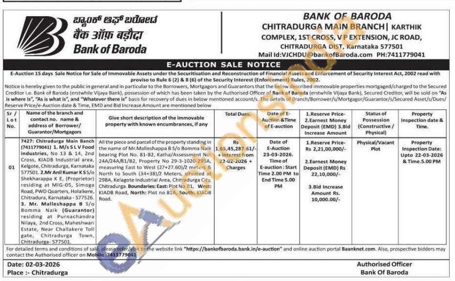 All the piece and parcel of the property standing in the name of Mr. Malleshappa B S/o Bomma Naik bearing Plot No. 81-82, Katha/Assessment No: 24A/24A/81/B2, Property No 29-3-1020-2984, measuring East to West (27+27.60)/2 meters & North to South (34+38)/2 Meters, situated at 298A, Kelagote Industrial Area, Chitradurga City, Chitradurga. Boundaries: East: Plot No B1, West: KIADB Road, North: Plot no BIA, South: KIADB Road