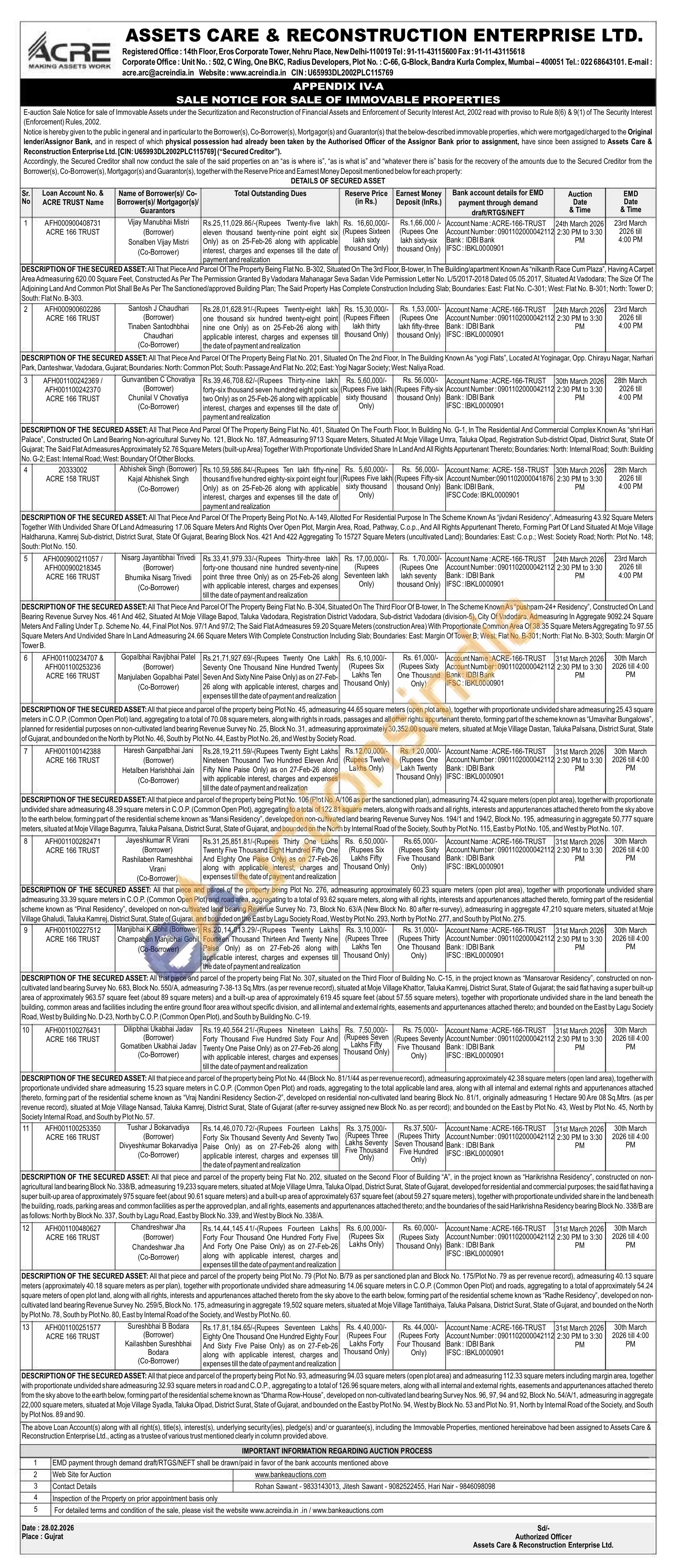 DESCRIPTION OF THE SECURED ASSET: All that piece and parcel of the property being Flat No. 202, situated on the Second Floor of Building "A", in the project known as "Harikrishna Residency", constructed on non-agricultural land bearing Block No. 338/B, admeasuring 19,233 square meters, situated at Moje Village Umra, Taluka Olpad, District Surat, State of Gujarat, developed for residential and commercial purposes; the said flat having a super built-up area of approximately 975 square feet (about 90.61 square meters) and a built-up area of approximately 637 square feet (about 59.27 square meters), together with proportionate undivided share in the land beneath the building, roads, parking areas and common facilities as per the approved plan, and all rights, easements and appurtenances attached thereto; and the boundaries of the said Harikrishna Residency bearing Block No. 338/B are as follows: North by Block No. 337, South by Lagu Road, East by Block No. 339, and West by Block No. 338/