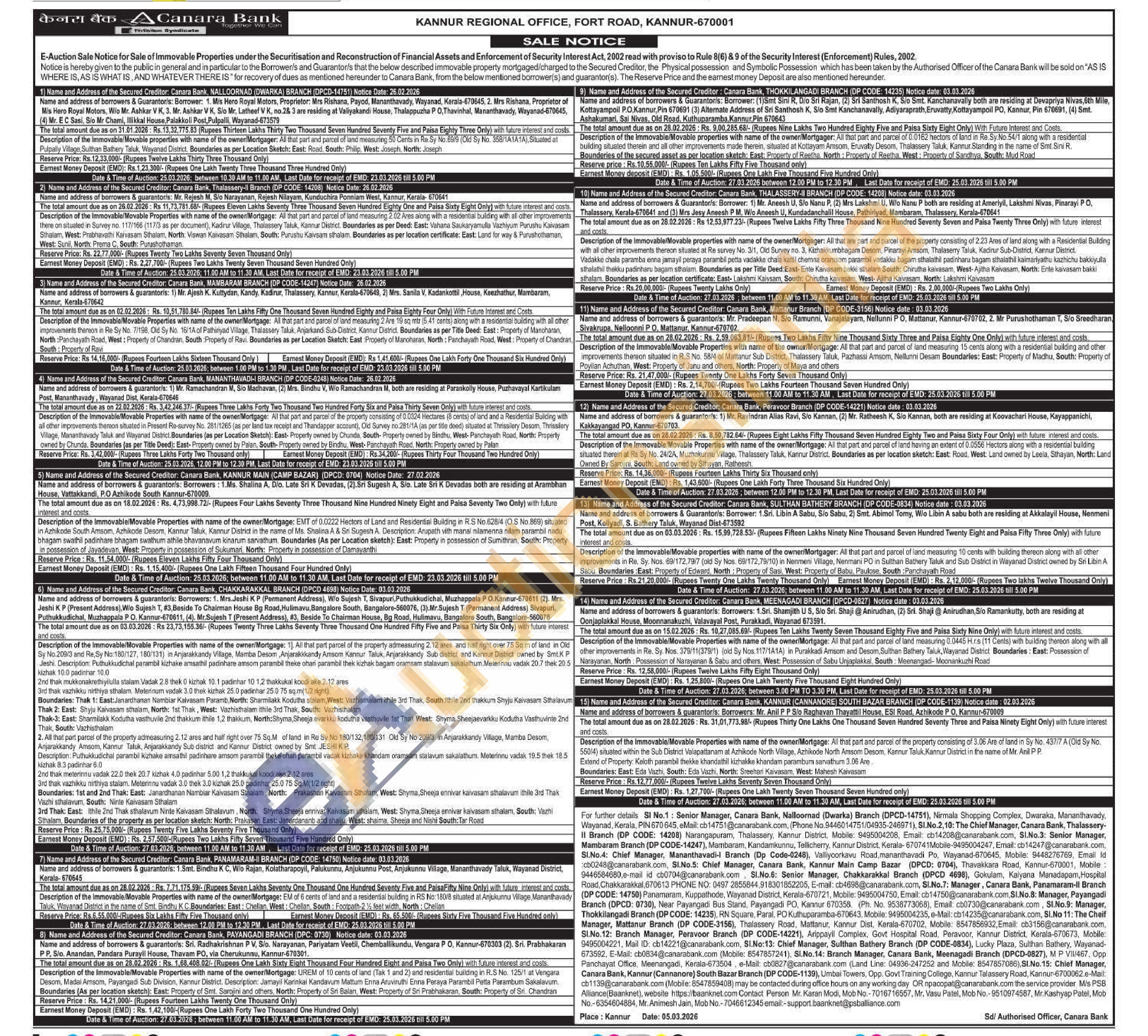 Description of the Immovable/Movable Properties with name of the owner/Mortgage: All that part and parcel of land measuring 0.0445 H.rs (11 Cents) with building thereon along with all other improvements in Re. Sy. Nos. 379/11(379/1) (old Sy Nos. 117/1A1A) in Purakkadi Amsom and Desom, Suithan Bathery Taluk, Wayanad District Boundaries: East: Possession of Narayanan, North: Possession of Narayanan & Sabu and others, West: Possession of Sabu Unjaplakkal, South: Meenangadi-Moonankuzhi Road