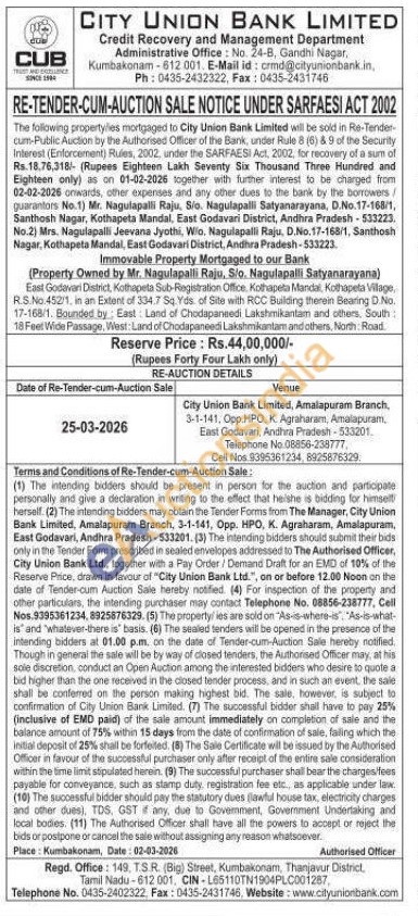 East Godavari District, Kothapeta Sub-Registration Office Kothapeta Mandal, Kothapeta Vilage, R.S.No.452/1, in an Extent of 334.7 Sq. Yds of Site with RCC Building therein Bearing D.No. 17-168/1. Bounded by: East Land of Chodapaneedi Lakshmikantam and others, South 18 Feet Wide Passage, West: Land of Chodapaneedi Lakshmikantam and others. North: Road
