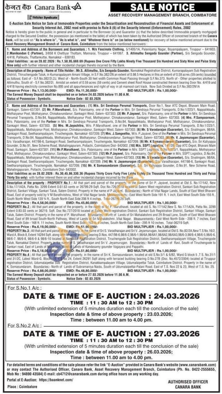 Description of the property: PROPERTY No.4: All that part and parcel of the property, in the name of Sri K. Somasundaram, located at old S.No.5/1 & 6/B2, Ward G block 5.TS. No.31/1 and 31/2C, Latest Ward-G, Block-16, T.S No 24, Extent 26291 Sqft along with terraced building bearing D.No.278 (Doc. No.4572/2004) located at Tiruppur registration District, Udumalaipettai Sub Registration District, Kanakkampalayam Village, Udumalaipettai Taluk, Coimbatore District. Property in the name of K. Somasundaram. Boundaries: North of Lands of Subramaniya Naidu, South of Udumalaipettai-Palani Road, East of T.S. Nos 22 & 23, West of T.S. No. 25