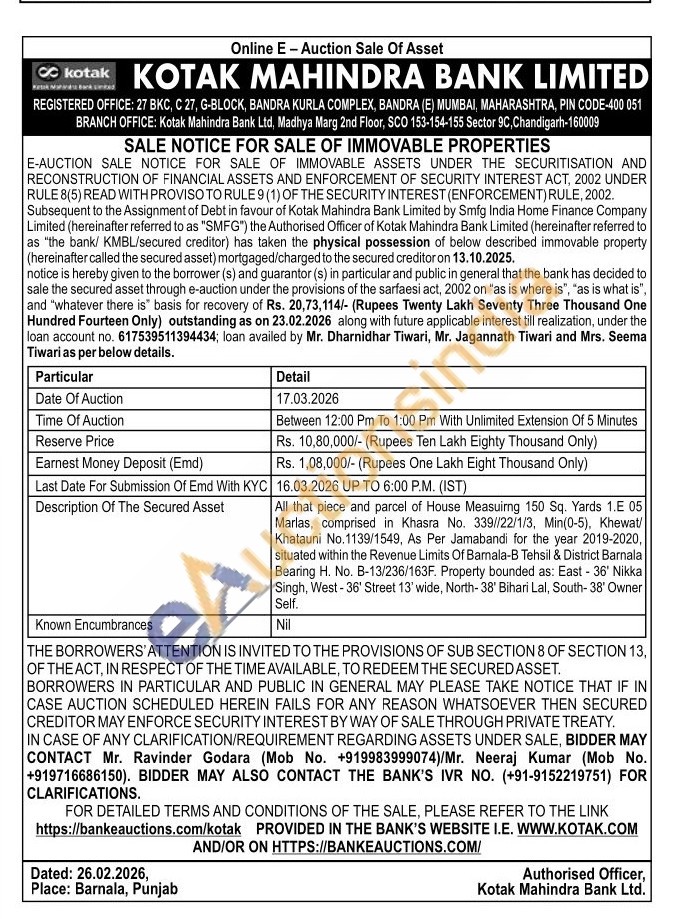 All that piece and parcel of House Measuirng 150 Sq. Yards 1.E 05 Marlas, comprised in Khasra No. 339//22/1/3, Min(0-5), Khewat/Khatauni No.1139/1549, As Per Jamabandi for the year 2019-2020, situated within the Revenue Limits Of Barnala-B Tehsil & District Barnala Bearing H. No. B-13/236/163F. Property bounded as: East - 36' Nikka Singh, West-36' Street 13' wide, North-38' Bihari Lal, South-38' Owner Self.
