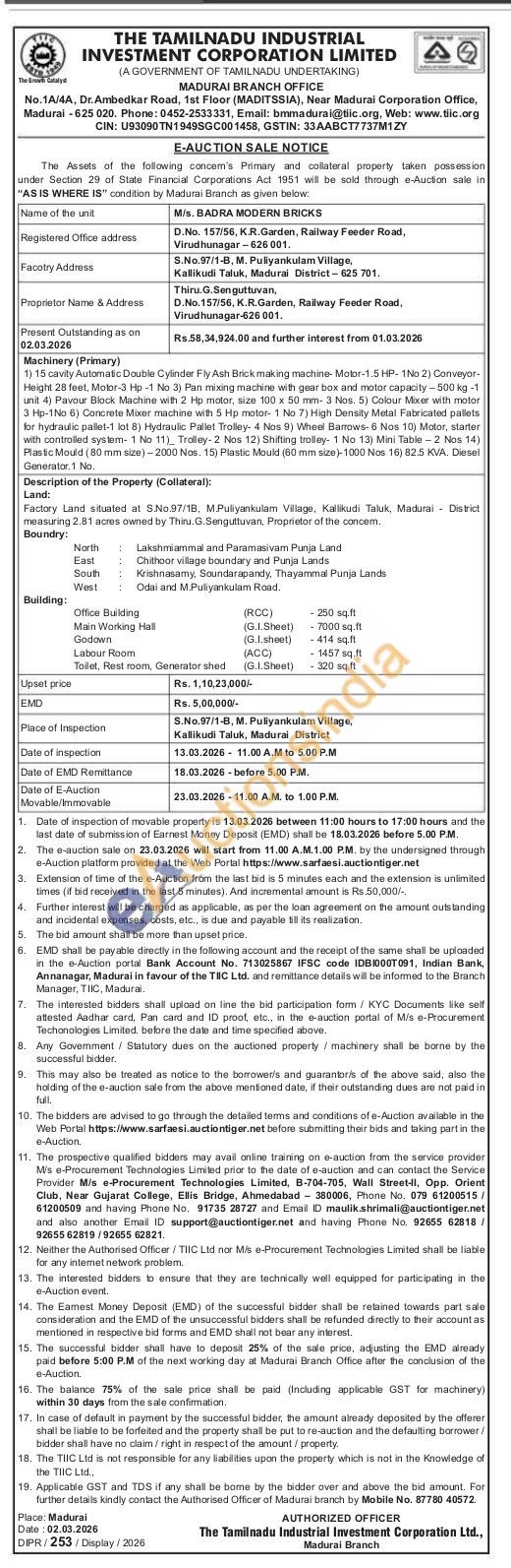 Land: Factory Land situated at S.No.97/18, M.Puliyankulam Village, Kallikudi Taluk, Madurai District measuring 2.81 acres owned by Thiru. G.Senguttuvan, Proprietor of the concem. Boundry: North Lakshmiammal and Paramasivam Punja Land East Chithoor village boundary and Punja Lands South Krishnasamy Soundarapandy, Thayammal Punja Lands West Odai and M.Puliyankulam Road. Building: Office Building (RCC) -250 sq.ft Main Working Hall (G.1.Sheet) -7000 sq.ft Godown (G.l.sheet) -414 sqft Labour Room (ACC) 1457 sq.ft Toilet, Rest room, Generator shed (G.I.Sheet) -320 sq.ft