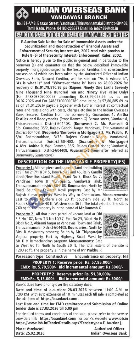 Property 1: All that piece and parcel of land and building at S F No 217/1 &3/15, Door No 45 and 46, Rajiv Gandhi street(New Bus stand Road), Ward No E, Block No 7, Vandavasi Town & Municipality, Vandavasi Taluk, Thiruvannamalai district-604408. Boundaries: North by Road, South by Eswaran Kovil property, East by Mr Rajesh Kumar property, West by Way to Chettikulam. Measurements: East to West Northern side 20 ft, Southern side 20 ft. North to South Eastern side 40 ft, Western side 36 ft. The total extent of the site is 760 sq ft. The property is in the name of Mr Ramesh G.
