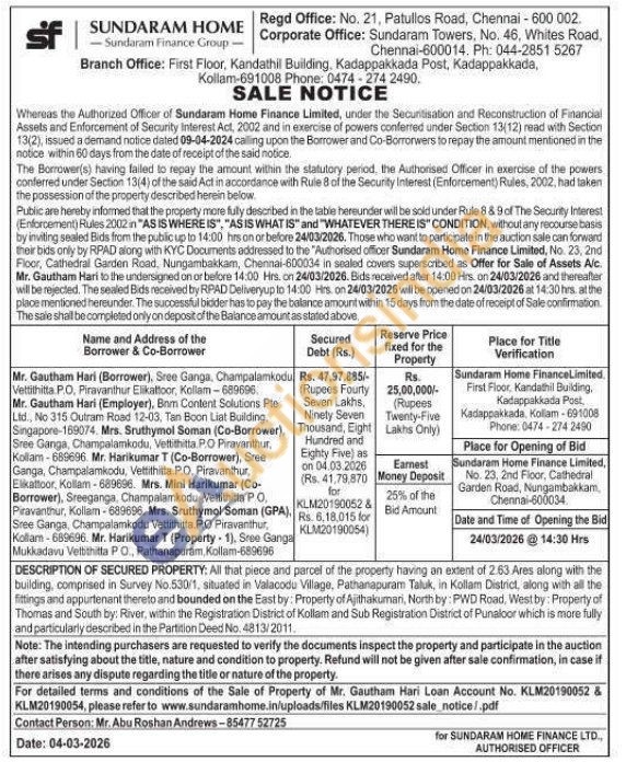 All that piece and parcel of the property having an extent of 2.63 Ares along with the building, comprised in Survey No.530/1, situated in Valacodu Village, Pathanapuram Taluk, in Kollam District, along with all the fittings and appurtenant thereto and bounded on the East by: Property of Ajithakumari, North by: PWD Road, West by: Property of Thomas and South by: River, within the Registration District of Kollam and Sub Registration District of Punaloor which is more fully and particularly described in the Partition Deed No. 4813/2011