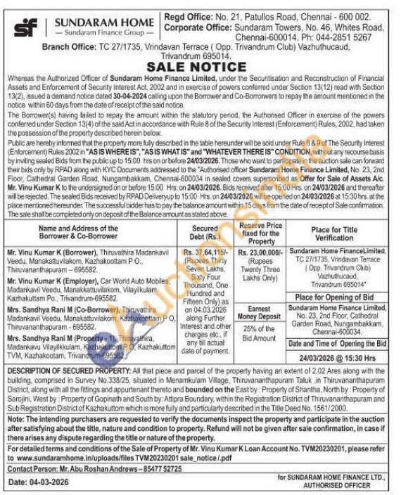 All that piece and parcel of the property having an extent of 2.02 Ares along with the building, comprised in Survey No.338/25, situated in Menamkulam Village. Thiruvananthapurarn Taluk in Thiruvananthapuram District, along with all the fittings and appurtenant thereto and bounded on the East by: Property of Shantha, North by: Property of Sarojini, West by: Property of Gopinath and South by: Attipra Boundary, within the Registration District of Thiruvananthapuram and Sub Registration District of Kazhakuttom which is more fully and particularly described in the Title Deed No. 1561/2000