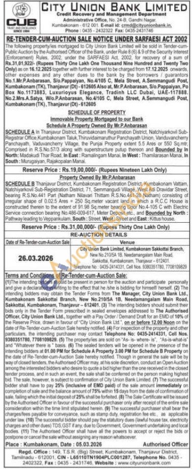 Immovable Property Mortgaged to our Bank : Schedule A Property Owned By Mr.P.Anbarasan : SCHEDULE A in Thanjavur District, Kumbakonam Registration District, Natchiyarkovil Sub-Registrar Office, Kumbakonam Taluk, Thiruvidaimaruthur Panchayath Union, Vanduvancherry Panchayath, Vaduvancherry Village, the Punjai Property extent 5.5 Ares or 550 Sq.mtr, Comprised in R.S.No.57/3 along with superstructure putup thereon and Bounded by In North: Madakudi Thar Road, In East: Ramalingam Manai, In West: Thamilarasan Manai, In South: Murugaiyan, Rajaikopalan Manai