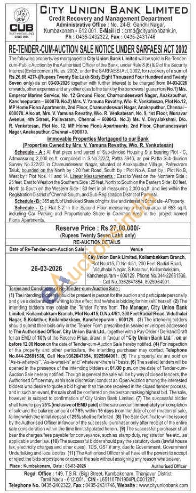 Immovable Properties Mortgaged to our Bank (Properties Owned by Mrs. V. Yamuna Revathy, W/o. R. Venkatesan) : Schedule A: All that piece and parcel of Sub-divided Housing Site bearing Plot - C. Admeasuring 2.000 sq.ft, comprised in S.No.322/2, Patta 3946, as per Patta Sub-division Survey No.322/23 in Chamundeswari Nagar, situated at Anakaputhur Village, Pallavaram Taluk, bounded on the North by: 20 feet Road, South by: Plot No.A. East by: Plot No.B, West by: Plot Nos. 11 and 14. Linear Measurements: East to West on the Northern Side 25 feet, East to West on the Southem Side: 25 feet, North to South on the Eastern Side: 80 feet, North to South on the Western Side: 80 feet in all measunng 2,000 sq.ft. and lies within the Registration District of Chennai South, and Sub-Registration District of Pammal