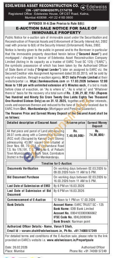 All that piece and parcel of Land admeasuring 28.07 cents along with a Commercial Building (RCC roof) (Occupied by Kannan Dept. Stores) admeasuring 43,067 square feet situated at Door Nos. 69, 70, 70/1 of Vannandurai Road T.S. No 176,191, T. S. Ward No 6, of Pollachi Town Municipality, Pollachi Taluk, Coimbatore District in the name of Shri Manikandaraju.