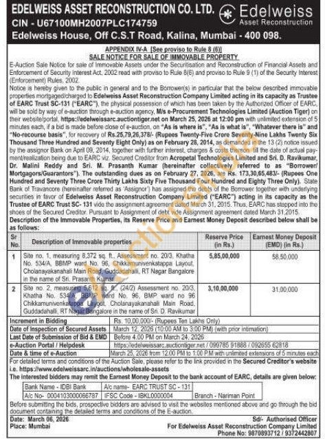 Site no. 1, measuring 6,372 sq. ft.. Assessment no. 2013, Khatha No. 534/A, BEMP ward No. 96, Chikkamunivenkatappa Layout Cholanayakanahali Main Road, Guddadahalli, RT Nagar Bangalore in the name of Sr. Prasanth Kumar
